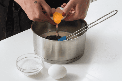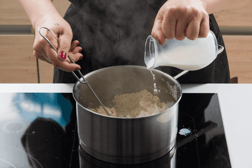 Добавить молоко и перемешать венчиком.