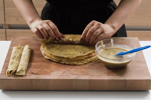 Блины смазать щавелем и скатать рулетиками.