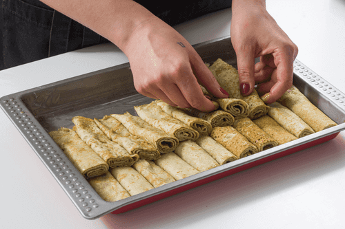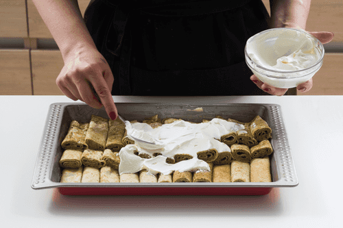 Разрезать рулетики пополам и выложить их в форму, смазанную маслом.