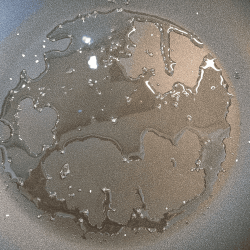 На сковороду влить масло, добавить щепотку крупной соли и поставить на сильный огонь.