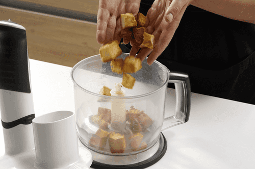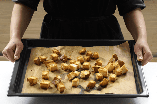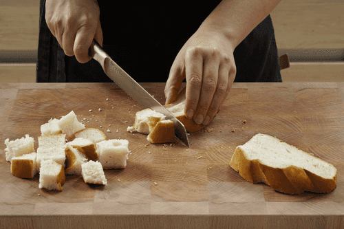 Хлеб нарезать небольшими кусочками вместе с корками.