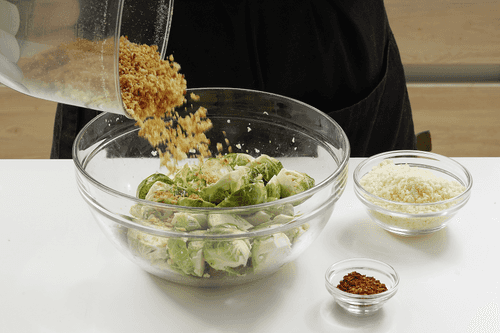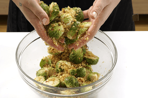 Влить оливковое масло и перемешать руками, чтобы крошка хлеба и пармезан равномерно распределились по капусте.
