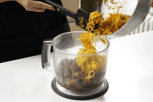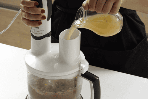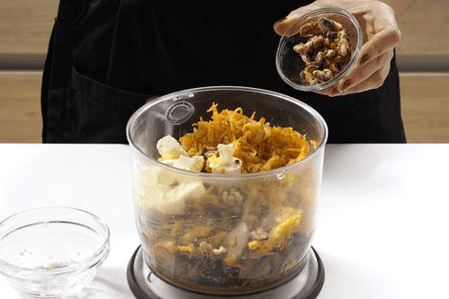Выложить в блендер печень вместе с маслом и соками, добавить половину орехов, лук и морковь.