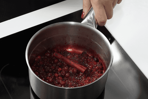 Высыпать клюкву в сотейник, добавить палочку корицы и на небольшом огне готовить клюкву, пока ягоды не начнут лопаться.