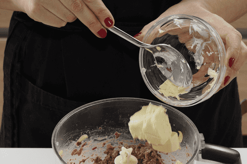 Добавить на сковороду еще 1 столовую ложку сливочного масла, растопить и выложить лук. Уменьшить огонь до минимума, выложить лук и томить его до прозрачности, не давая зажариться и потемнеть.