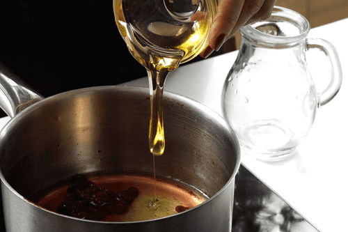 Из оставшейся половины клюквы вынуть палочку корицы, добавить мед, 100 мл воды и прогреть до кипения, процедить.