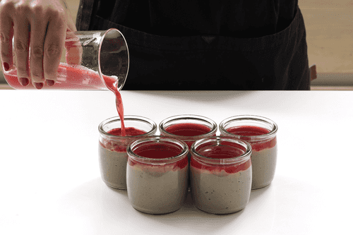 Приготовить клюквенное желе. Замочить желатин в 3 столовых ложках воды. Прогреть желатин 10 секунд в микроволновке и перемешать.