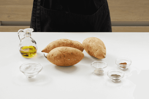 Смешать батат с оливковым маслом и всыпать смесь специй.