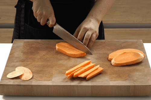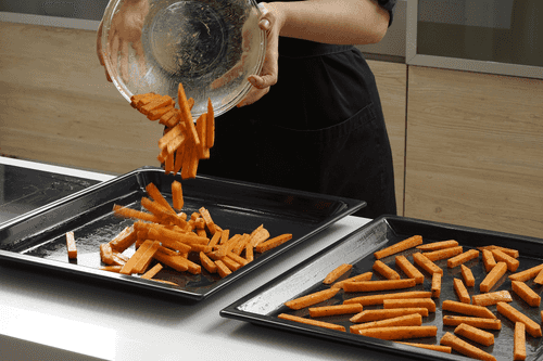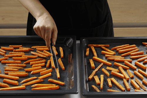 Выпекать в духовке 15 минут. Достать батат из духовки, перевернуть палочки на другую сторону и вернуть обратно в духовку еще на 15 минут.