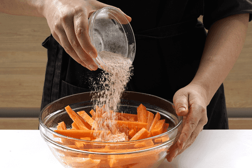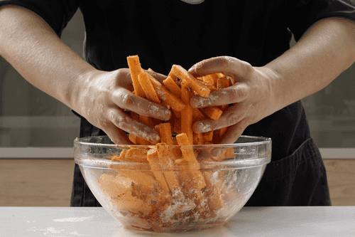 Перемешать батат с сухой смесью так, чтобы она равномерно распределилась по брускам.