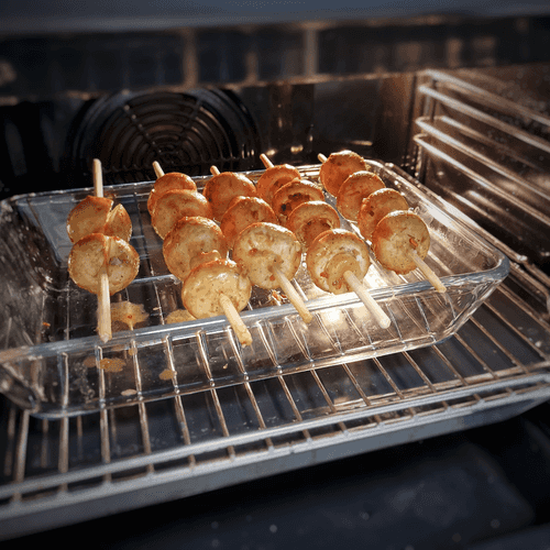 Нанизать грибы на шпажки и установить концы на форме для запекания.