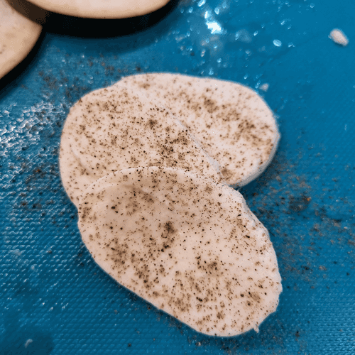 Моцареллу нарезать слайсами около 8 мм. Поперчить и немного посолить.
