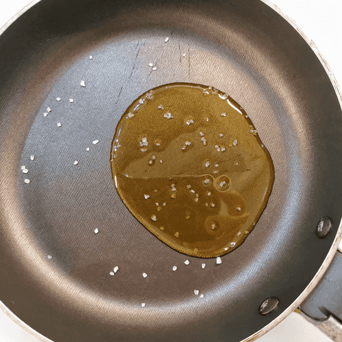 Разогреть на сковороде горчичное масло и добавить щепотку крупной соли.