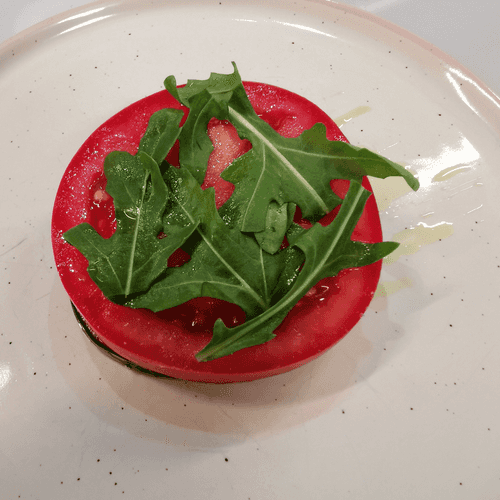 Сверху добавить листья руколы.