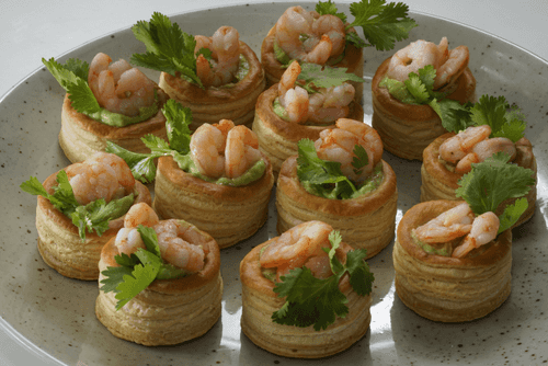 На праздниках тарталетки, наполненные разнообразными начинками, неизменно вызывают интерес. Их удобно есть без столовых приборов, порция даёт возможность насладиться вкусом не торопясь, а также они прекрасно дополняют алкогольные напитки. В нашем варианте используется сочетание креветок и гуакамоле. Гуакамоле можно сделать заранее, за несколько часов до мероприятия, а саму закуску стоит собирать прямо перед подачей на стол. Тарталетки можно приобрести в готовом виде.