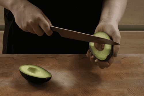 Авокадо разрезать пополам. Чтобы вынуть косточку, воткнуть в нее лезвие ножа и провернуть.