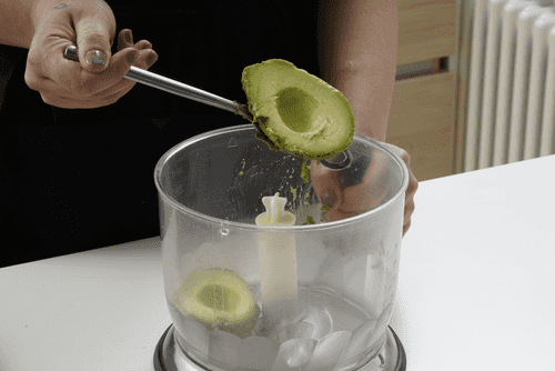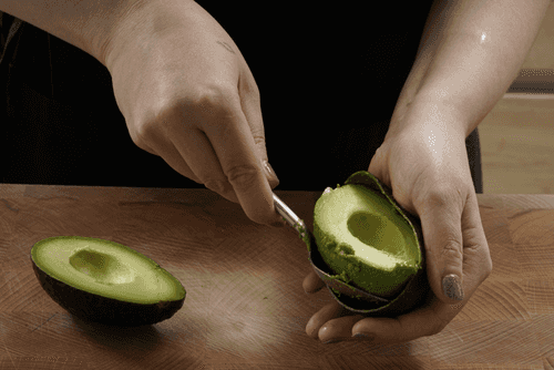 Столовой ложкой провести между мякотью и кожей авокадо, чтобы полностью отделить мякоть от кожуры.