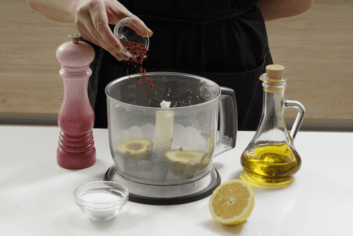 Добавить лимонный сок, оливковое масло, хлопья чили, соль и перец.