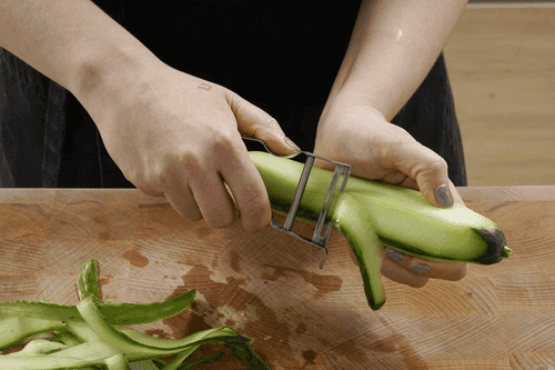 Нарезать огурцы тонкими лентами с помощью овощечистки. Желательно не резать часть с семенами: там слишком много воды, это может испортить итоговое блюдо.