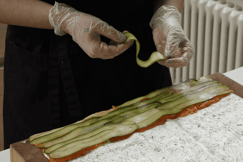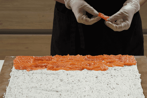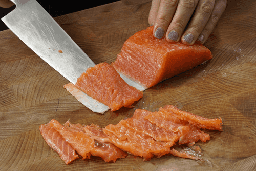 Нарезать рыбу тонкими кусочками. Чтобы сэкономить время, можно купить уже нарезанную рыбу.