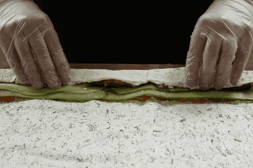 Скрутить лаваш в колбаску и нарезать на рулеты.