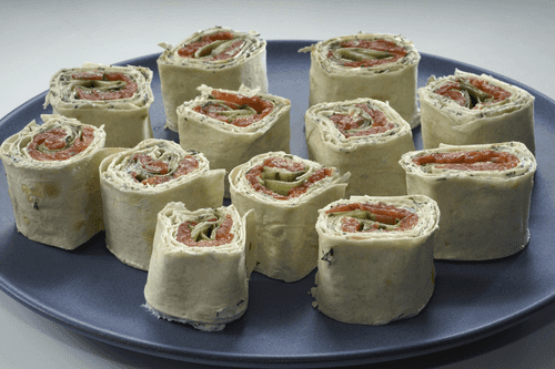 Можно заготовить скрученный лаваш за несколько часов до празднования и нарезать непосредственно перед подачей.