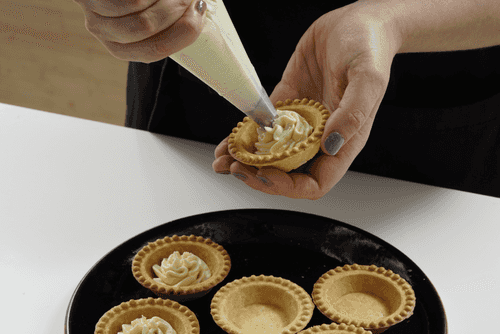 Выложить корзиночки на блюдо, в них из кондитерского мешка выдавить крем красивой пумпочкой, как безе.