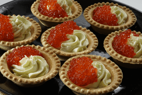 Тарталетки удобнее обычных бутербродов тем, что икра с них не соскальзывает и не падает, их удобно брать руками и отправлять в рот целиком. Так что если планируется вечеринка с фуршетом и танцами, такая закуска сводит на нет опасения, что внезапно пара икринок окажется у кого-нибудь в декольте. Васаби придает вкусу икры немного острой новизны. Только регулируйте остроту по своему вкусу: она не должна забивать сам тонкий вкус икры. И, кстати, васаби часто остается, когда вы заказываете доставку суши, вот вам шанс использовать эти остатки с толком и пользой.