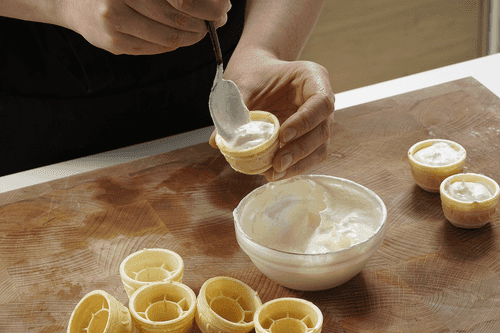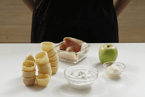 Разрезать дольки яблока пополам и выложить поверх тарталеток.