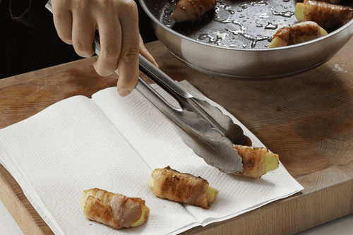 Переложить на бумажные полотенца, чтобы убрать лишний жир.