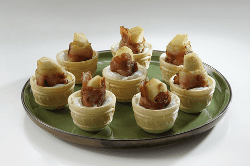 Сочетание сладких фруктов и мяса всегда рождает в закусках интригу, но дымный след копченого бекона придает ему новую глубину. Фокус в том, чтобы дольки яблока завернуть в ломтики бекона и в таком виде обжарить, они спекаются вместе, и получается красота: сверху — румяная лоснящаяся беконная корка, а внизу — превратившаяся в полупюре яблочная долька, пропитавшаяся ароматом копчености. Если в холодильнике у вас вместо бекона найдется хорошая копченая колбаса (а под праздник она там точно найдется) — не сомневайтесь, нарезайте как можно более тонкими кусочками и заворачивайте яблоки в них. А запекать внутри копченостей можно не только яблоки, но и дольки крепких груш или чернослив.