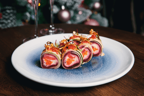 Ролл а-ля рюс – это оригинальное сочетание русских традиций и японской техники приготовления. Вдохновленный классическими салатами русской кухни, он превращает знакомые ингредиенты в утонченное произведение кулинарного искусства. Свекла, картофель и морковь придают блюду нежную текстуру и естественную сладость, а копченый тунец добавляет насыщенный вкус. Огурец освежает, а красная икра и соус унаги придают утонченные ноты умами. Посыпка из сублимированного желтка и сусального золота делает подачу по-настоящему роскошной. Этот ролл идеально подходит для тех, кто ценит смелые гастрономические эксперименты и готов открыть для себя новое измерение вкуса, соединяющее культуру Востока и Запада.