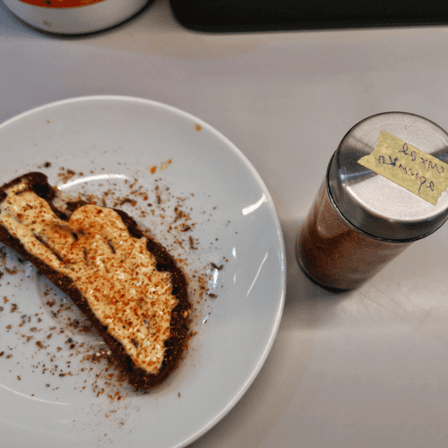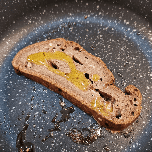 Кусочек хлеба обжарить на горчичном масле с обеих сторон.