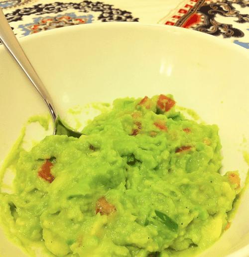 Разделите авокадо на две части, извлеките косточку, но не выбрасывайте ее. Ложкой выберете мякоть из кожуры и сложите в миску. Вилкой раскрошите мякоть. Добавьте лук, перец, чили, помидор и кориандр, посолите и вмешайте лимонный сок, чтобы овощи не потеряли цвет.