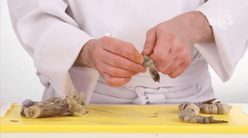 Крупные сырые креветки очистить, удалить черные нитки кишечника, для чего нужно сделать надрез по хребту — и черная ниточка легко вытягивается. Можно использовать уже очищенные креветки, их продают в супермаркетах.