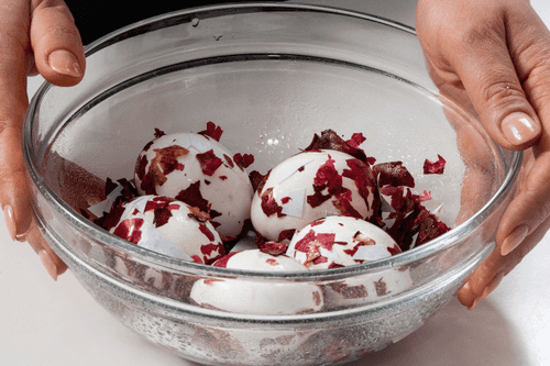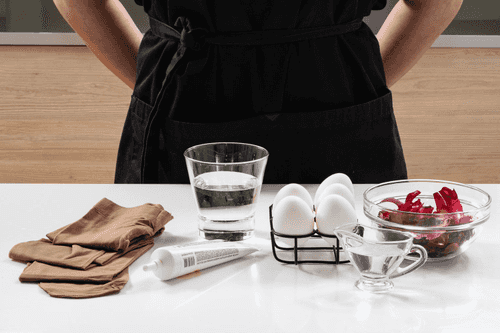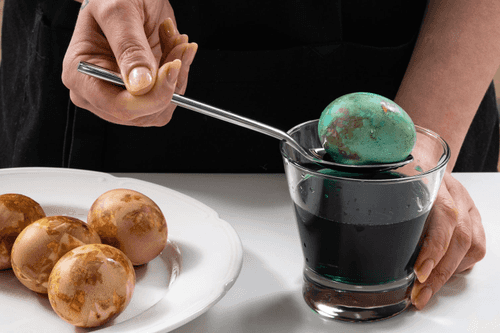 Развести краситель в 100 мл холодной воды, добавив ложку уксуса, и опустить в него яйца по очереди на 2–3 минуты. Этот шаг можно пропустить.