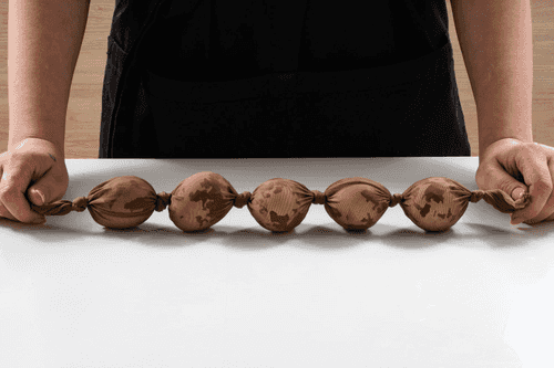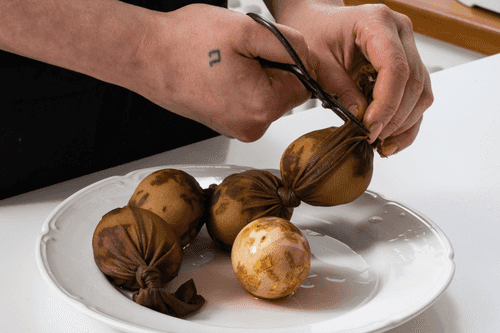 У тонкого капронового чулка отрезать носок, завязать чулок с одной стороны надежным узлом. Сложить по одному яйца в чулок, разделяя узлами. Нужно, чтобы капрон максимально прилегал к яйцам, чтобы бумага и шелуха остались на месте.