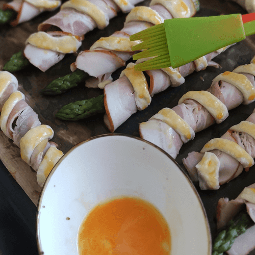 Переложить спаржу на противень и смазать яичным желтком тесто, чтобы оно подрумянилось при выпечке.