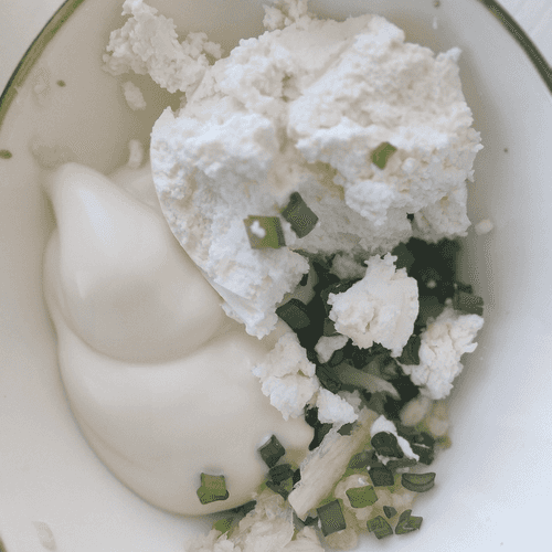 Для соуса в отдельной миске смешать творожный сыр, лук, немного домашнего майонеза и чеснок.