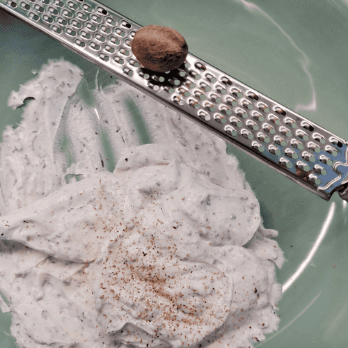 Добавить черный молотый перец и мускатный орех. Перемешать.
