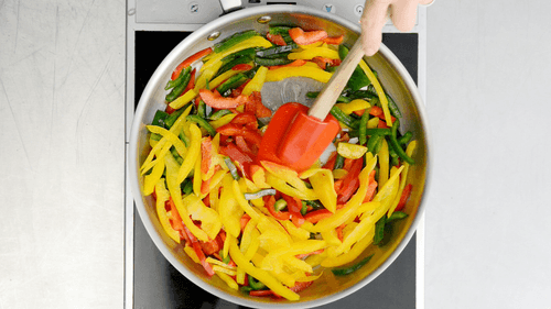Удалить из перцев семечки и все несъедобное, нарезать на тонкие полоски и обжарить с небольшим количеством масла до мягкости.