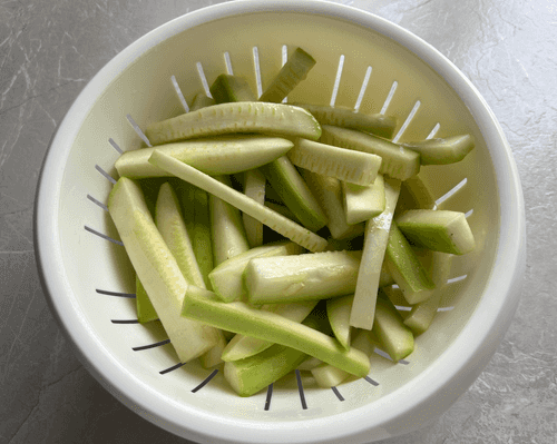Нарезать кабачки на брусочки.