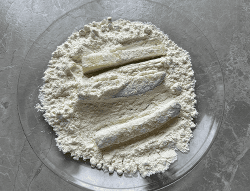 Обвалять кабачки в муке. Удобнее всего обвалять сразу все кабачки в муке и выложить их на доску.