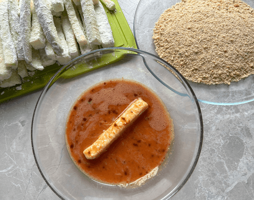 Брусок сначала отправить в миску с яйцом.