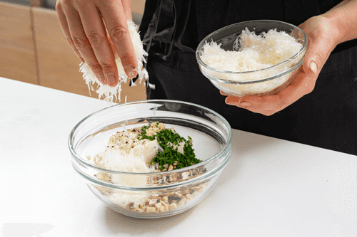 Смешать творожный сыр, пармезан, петрушку, чеснок и нарезанные грибы. Поперчить, солить не нужно.