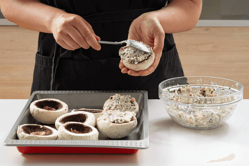 Начинить шляпки шампиньонов сырной смесью.