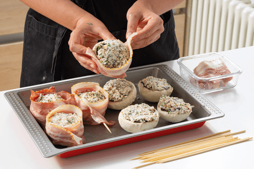 Завернуть начиненный гриб в ломтик бекона, проткнуть зубочисткой. Проделать то же самое с остальными грибами.