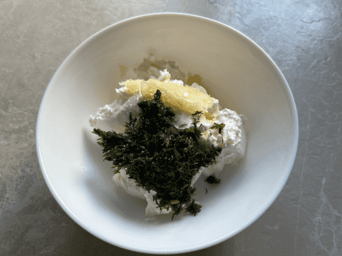 К творожному сыру добавить укроп и чеснок. Посолить по вкусу.