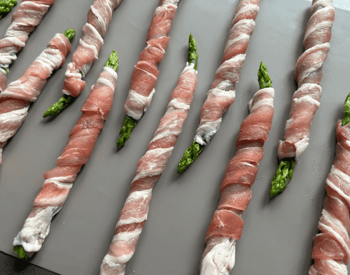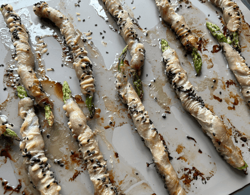 Выложить завернутую спаржу на противень, застеленный пергаментом или силиконовым ковриком.