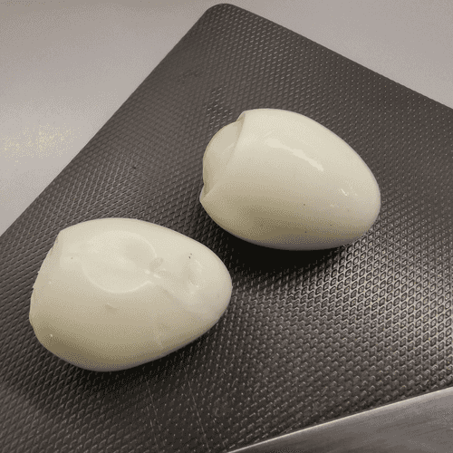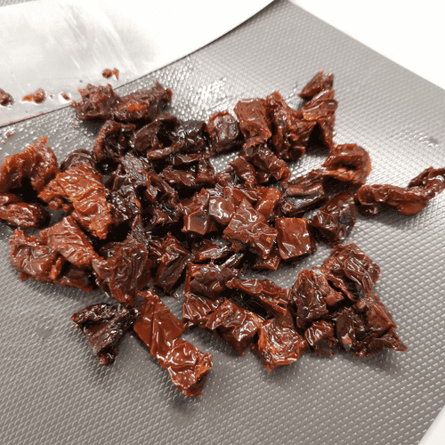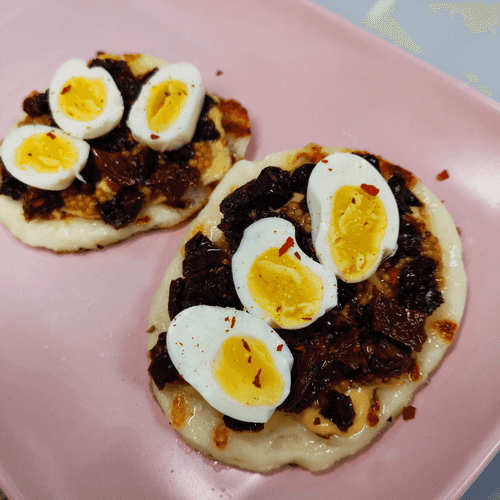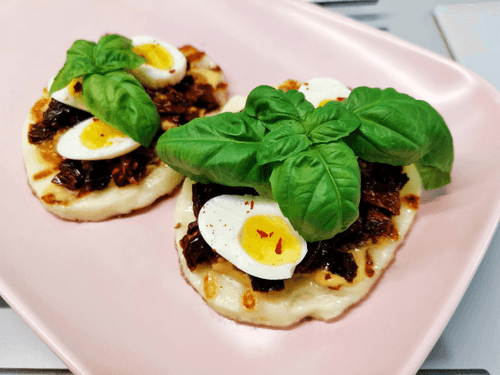 Вяленые томаты выложить на каждый ломтик. Яйца разрезать на три части и выложить сверху. Приправить перцем чили.